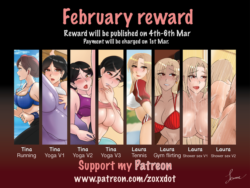 February Patreon project is done! This theme is about sport. Don't miss it! Total 9 pcs high quality art pieces with variations. You will get not only Tina wearing sexy sport outfits but also meet our new OC : Laura too! She is very good at sport and love to go to gym, not only for working out, but also looking for mens to... you know. She is like a queen where ever she goes and very tempted.